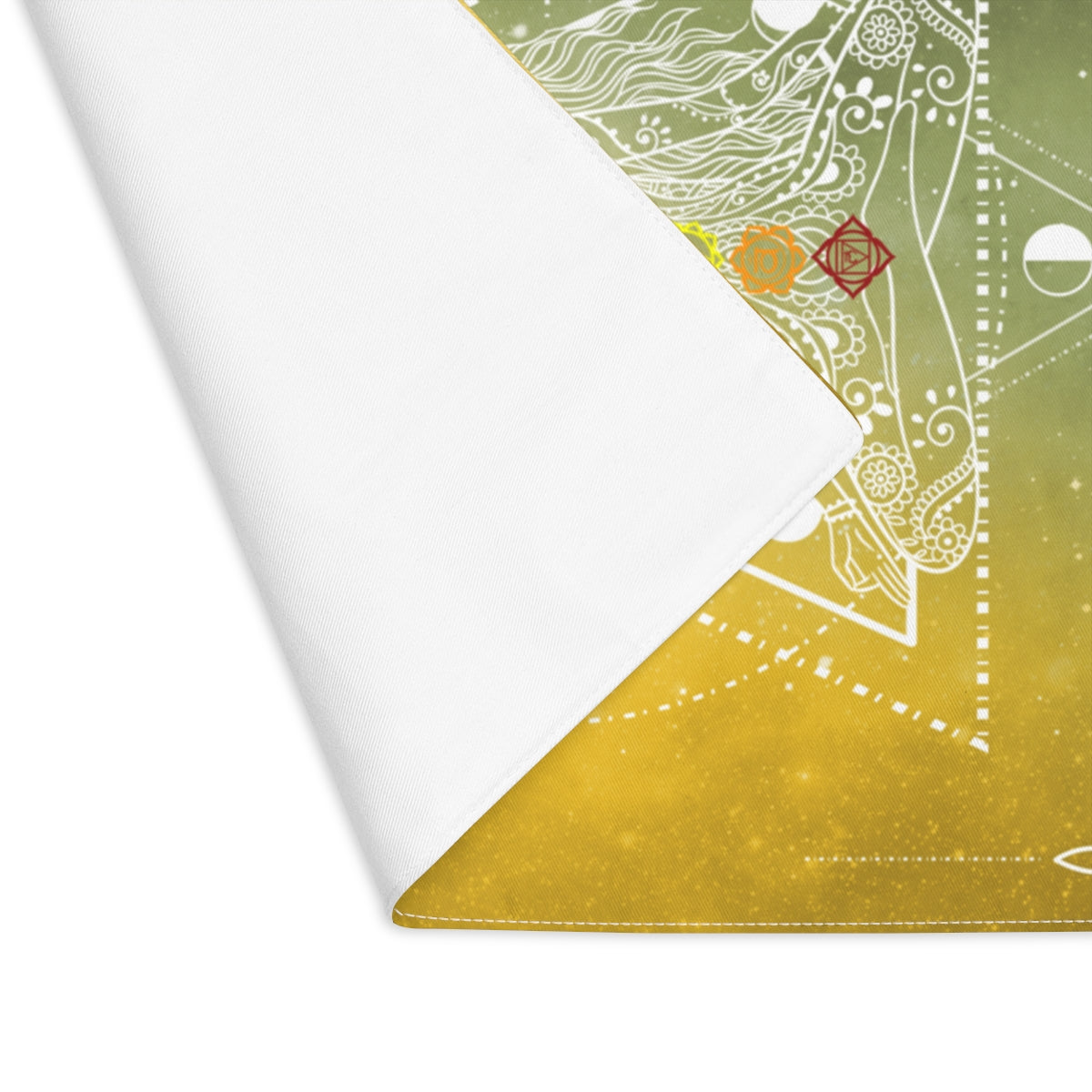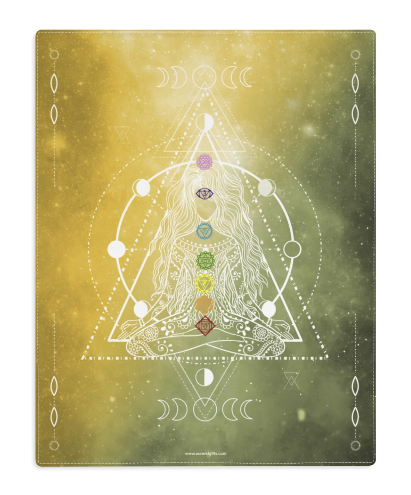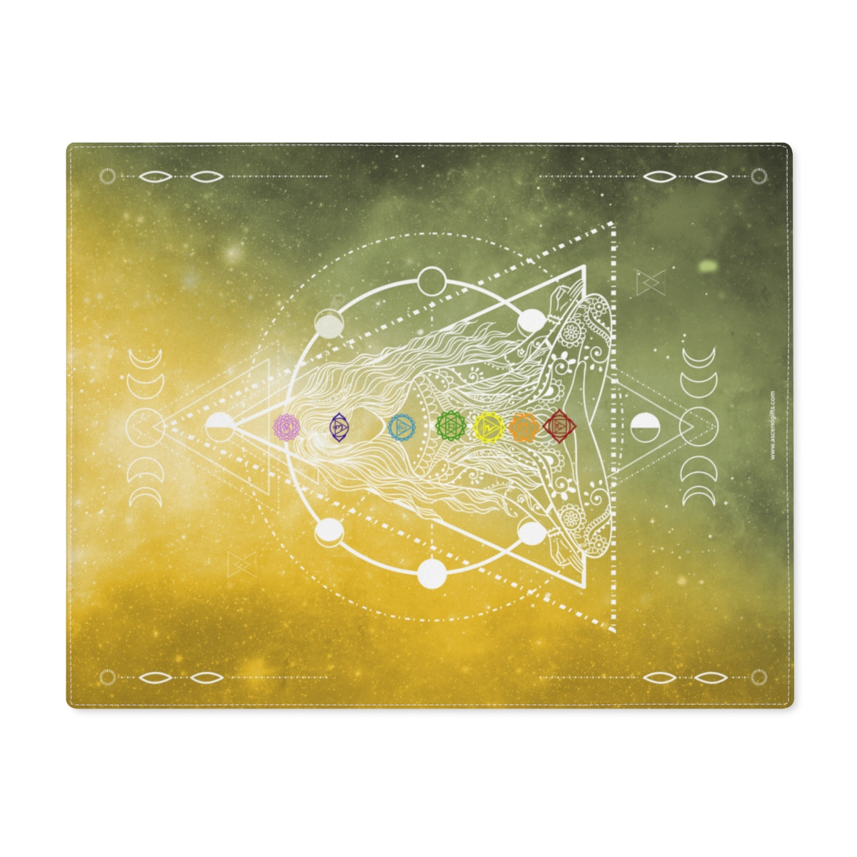Moon Phase Chakra Girl Grid Board with a double-sided construction, one-side print area, and a natural back, the size of a standard place mat. Made from durable cotton everyday use. These grids are resilient, easy to clean, and fade-resistant. This grid board features beautiful feathers, and the Arc Angles of the Four Directions as well as the elements.