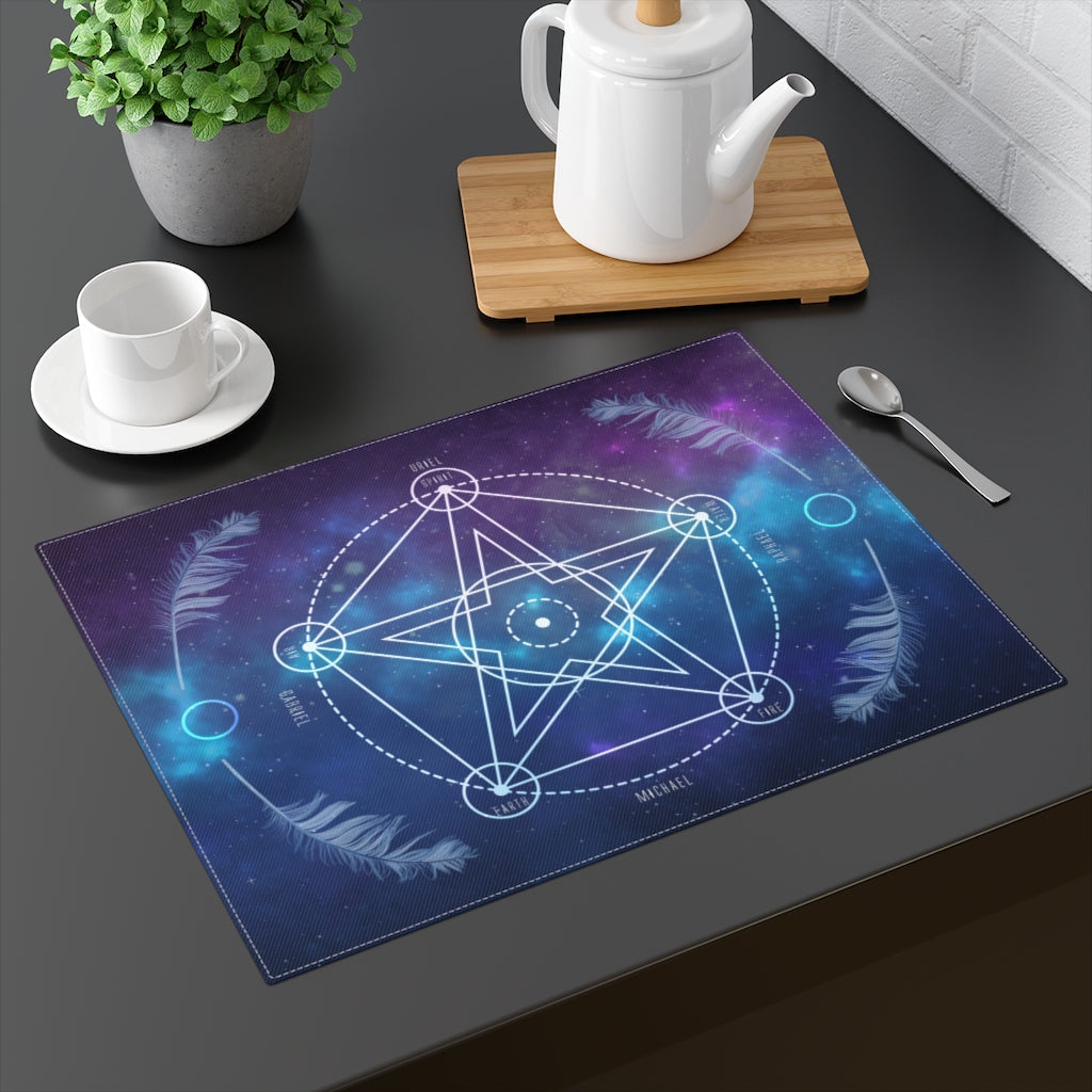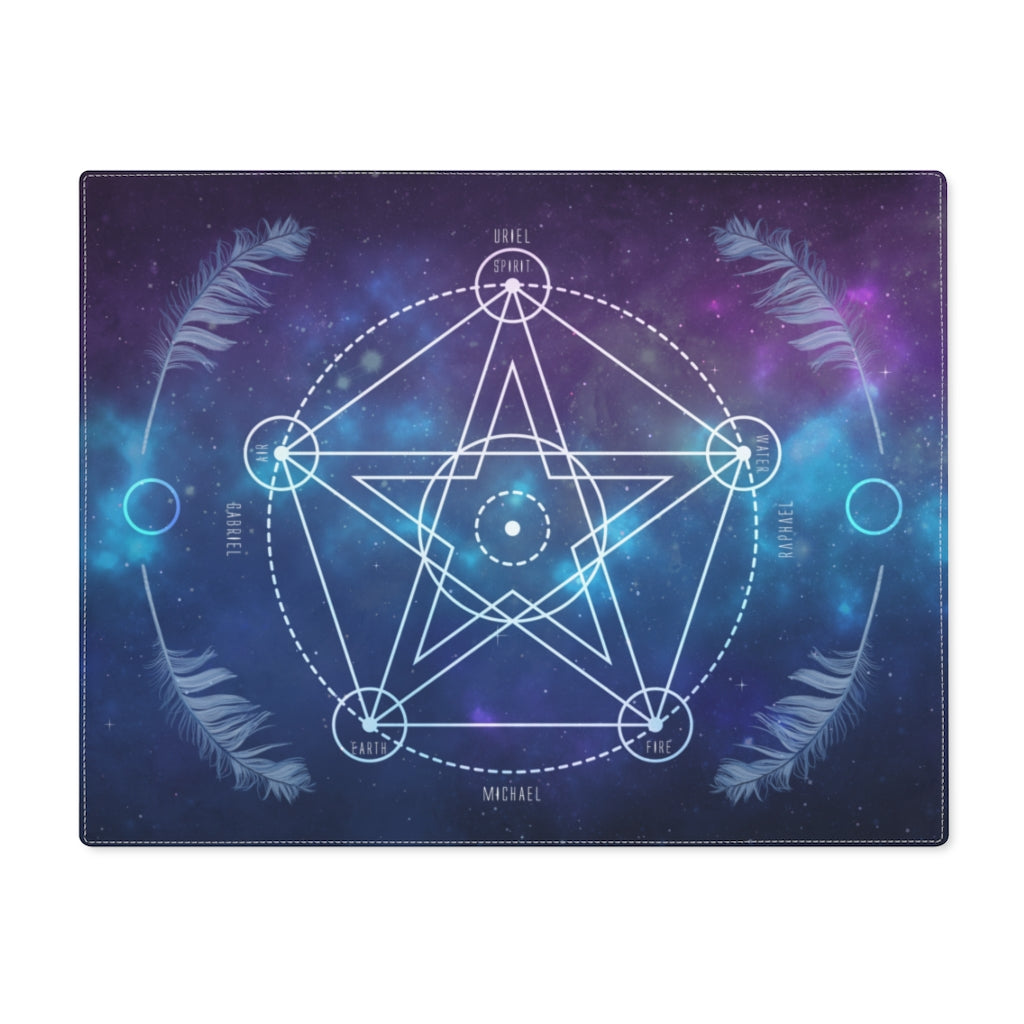 Pentacle Crystal Grid Board with a double-sided construction, one-side print area, and a natural back, the size of a standard place mat. Made from durable cotton everyday use. These grids are resilient, easy to clean, and fade-resistant. This grid board features beautiful feathers, and the Arc Angles of the Four Directions as well as the elements.