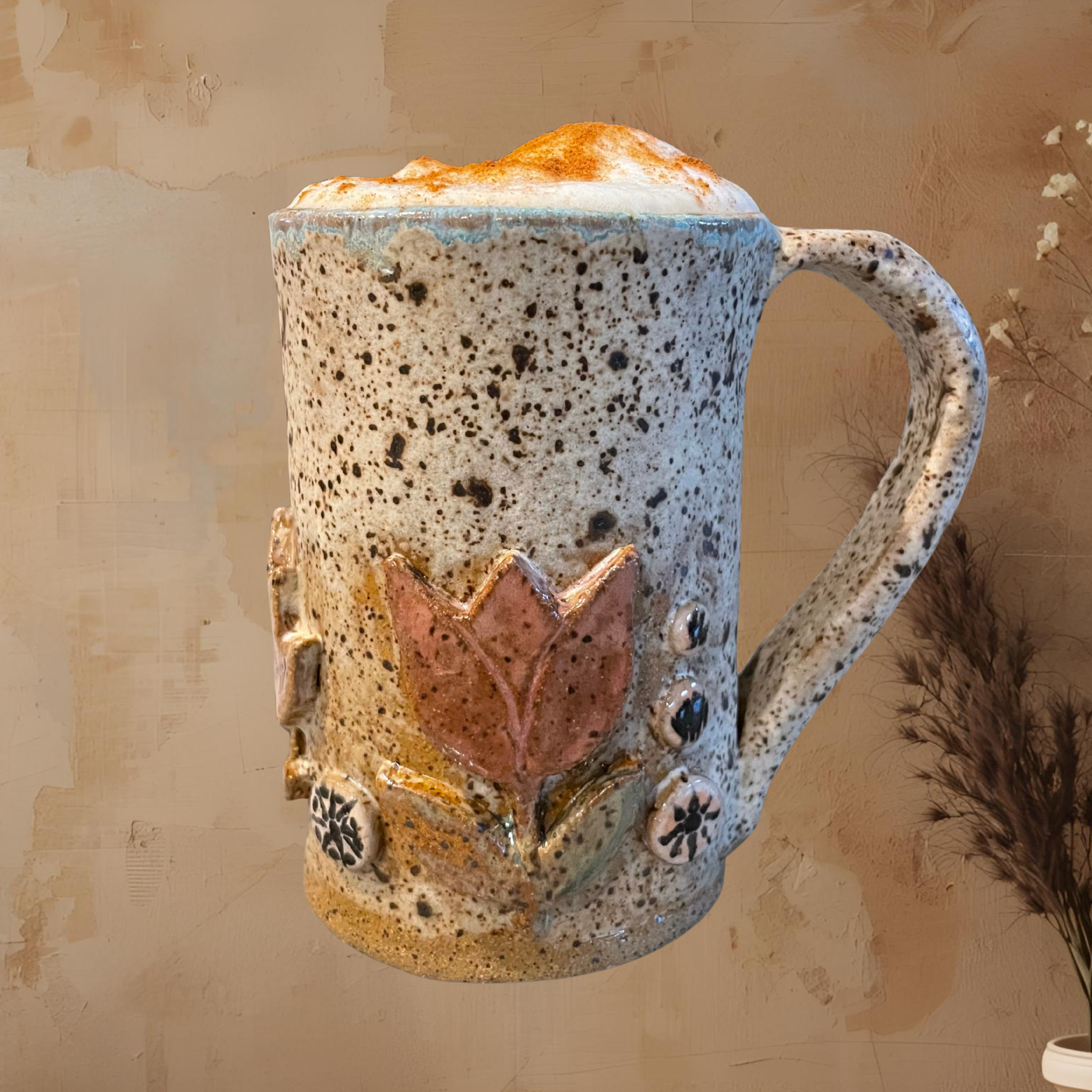 This hand built ceramic mug features a gorgeous speckled warm creamy background with three flowers in soft pastel colors. It brings Spring to Winter while you sip a warm drink. Holds approx. 6-8 oz