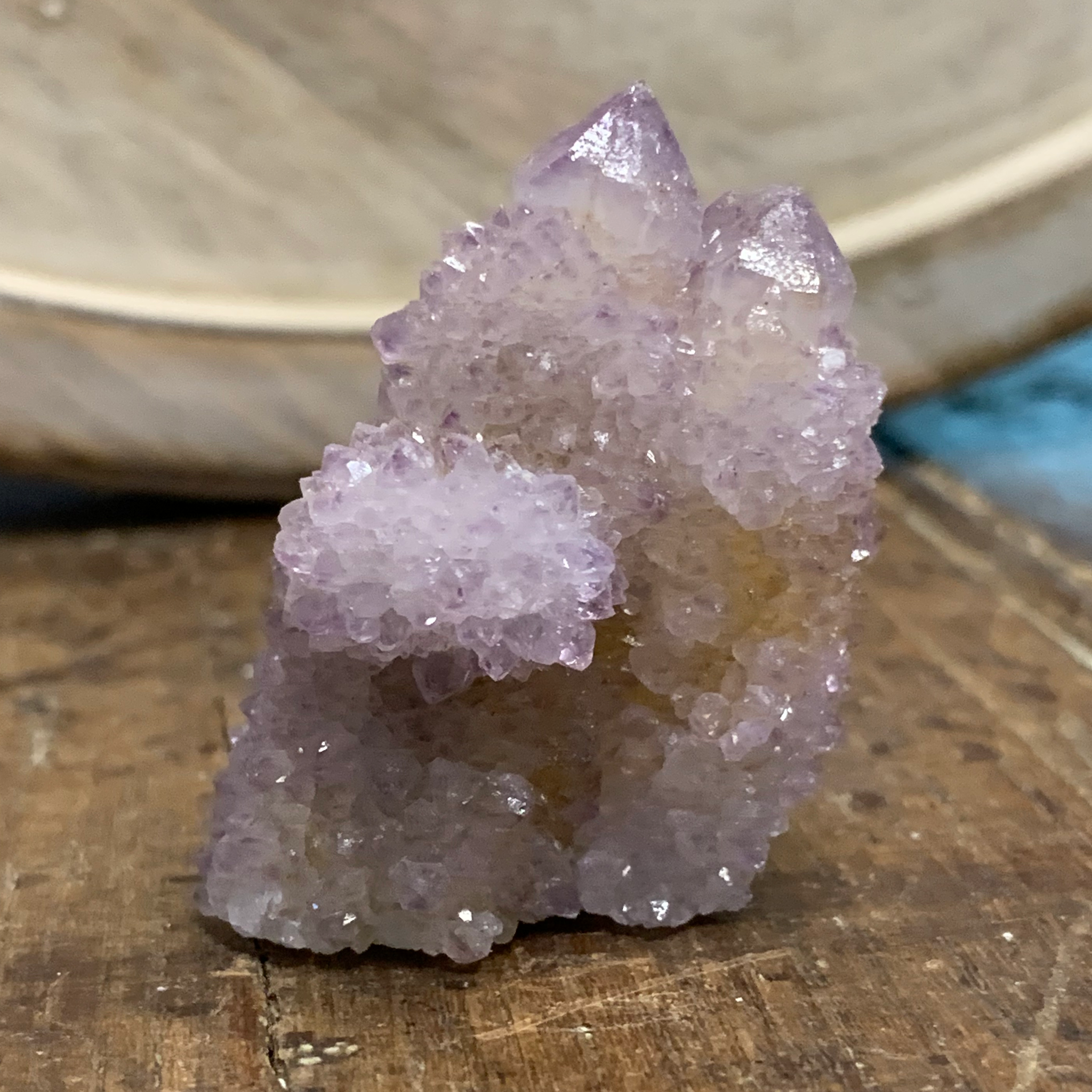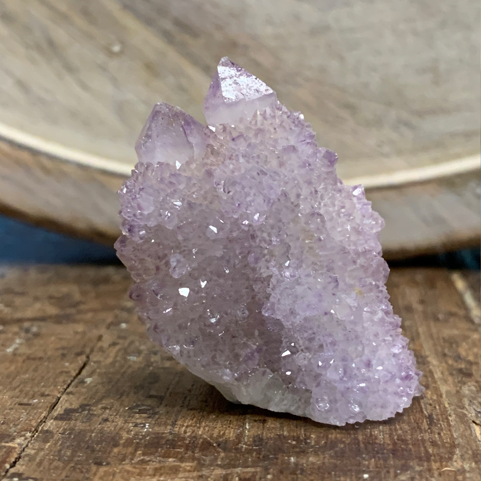 Spirit Quartz is an unusual member of the Quartz family - a community within a stone. Its core, a larger, candle-shaped crystal with a faceted termination point, is encrusted with hundreds of smaller crystal termination points. Also referred to as Cactus Quartz or Porcupine Quartz, it is found only in the Magaliesberg Mountain region of South Africa, first appearing around 2001. Most Spirit Quartz is Amethyst, though Citrine, Smokey, and White Quartz are also mined. This formation presents as a twin with a small bridge (appears to have another small formation sideways on one side). This piece has a flower growing on the back side.