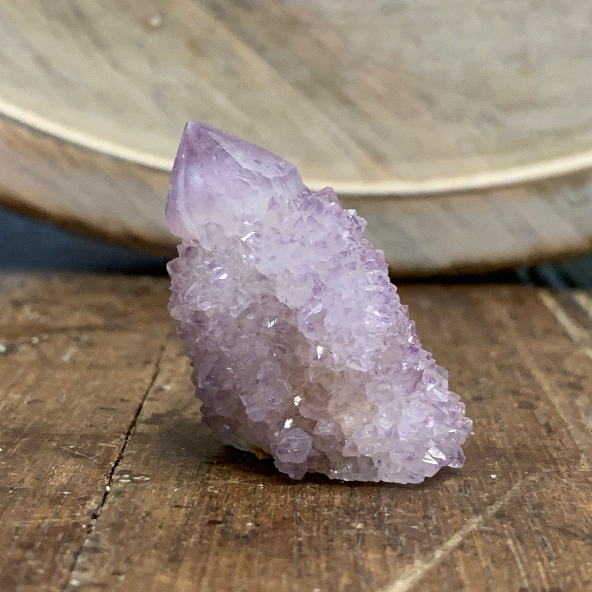 Spirit Quartz is an unusual member of the Quartz family - a community within a stone. Its core, a larger, candle-shaped crystal with a faceted termination point, is encrusted with hundreds of smaller crystal termination points. Also referred to as Cactus Quartz or Porcupine Quartz, it is found only in the Magaliesberg Mountain region of South Africa, first appearing around 2001. Most Spirit Quartz is Amethyst, though Citrine, Smokey, and White Quartz are also mined.