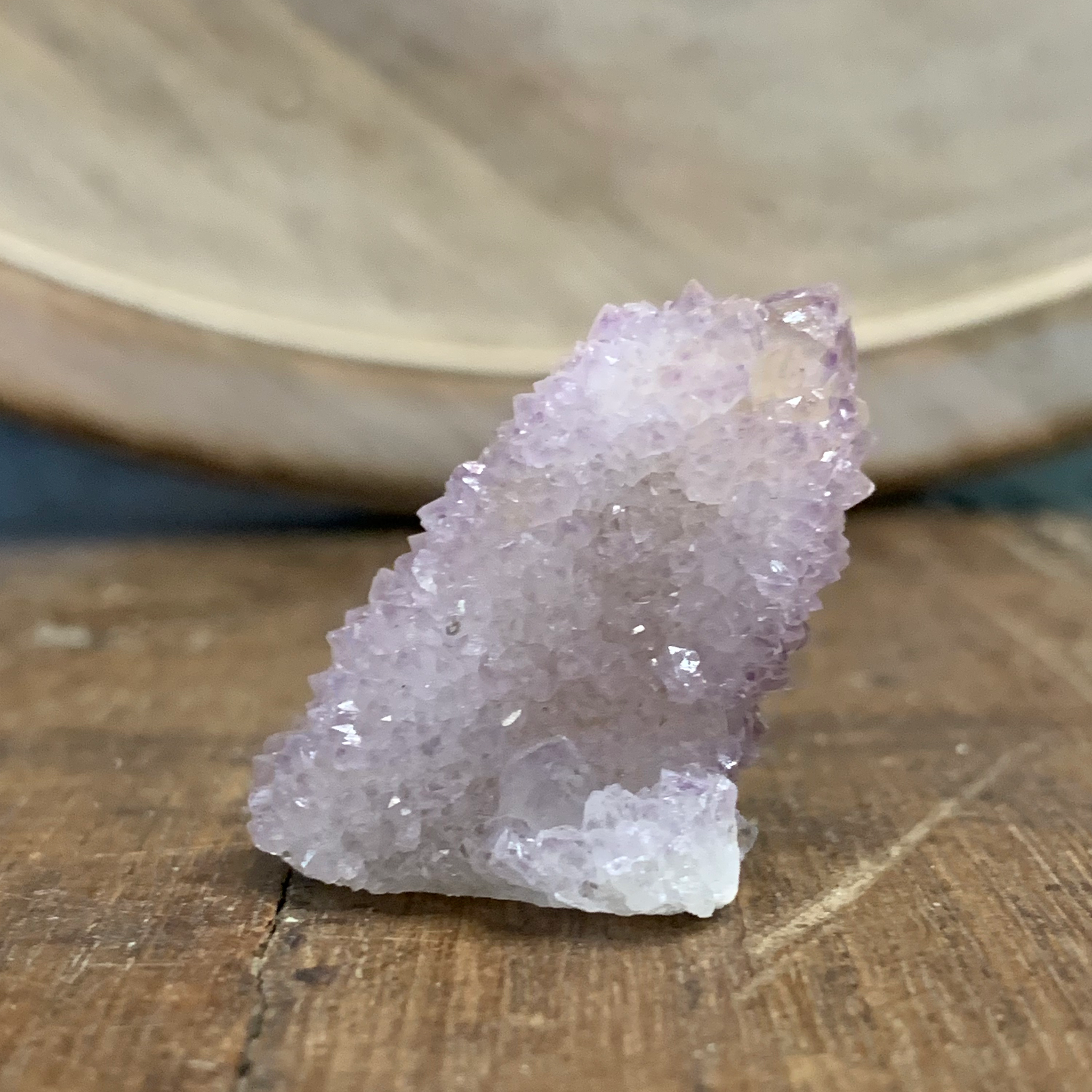 Spirit Quartz is an unusual member of the Quartz family - a community within a stone. Its core, a larger, candle-shaped crystal with a faceted termination point, is encrusted with hundreds of smaller crystal termination points. Also referred to as Cactus Quartz or Porcupine Quartz, it is found only in the Magaliesberg Mountain region of South Africa, first appearing around 2001. Most Spirit Quartz is Amethyst, though Citrine, Smokey, and White Quartz are also mined.