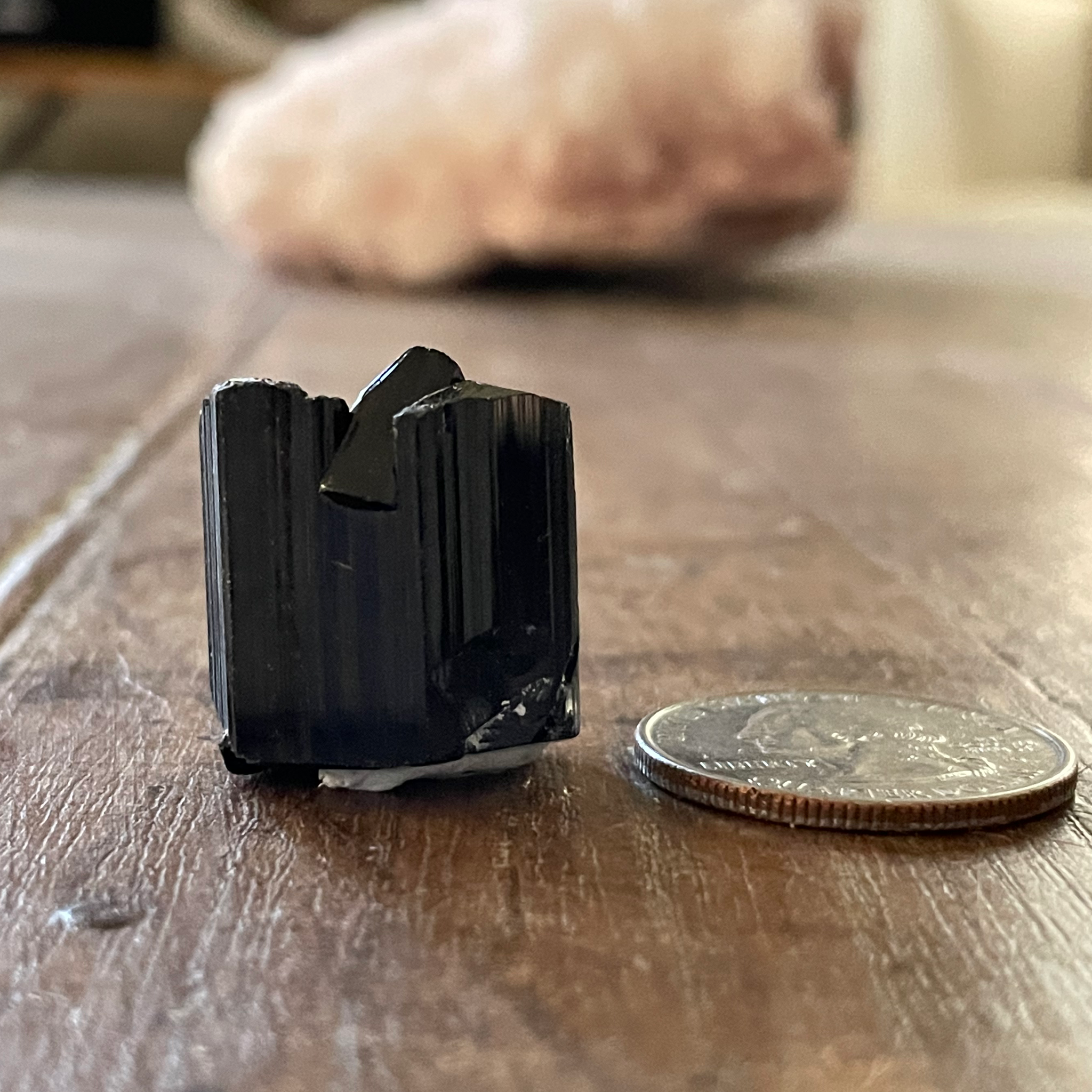 This black tourmaline crystal has a bridge formation (see the smaller crystal crossing it).