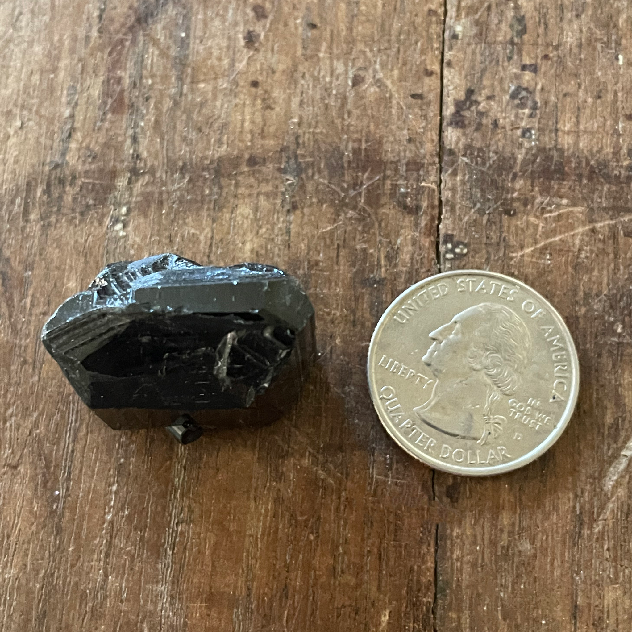 This black tourmaline crystal has a bridge formation (see the smaller crystal crossing it).