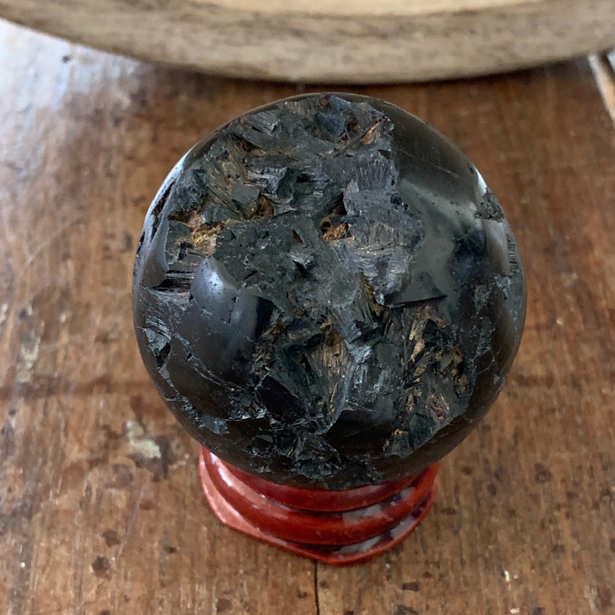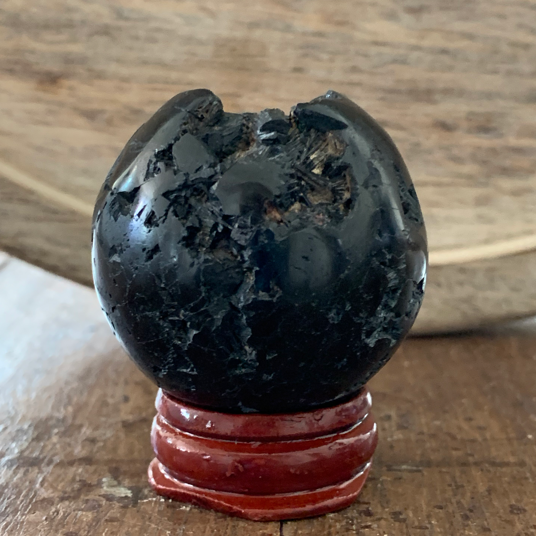 This Black Tourmaline Sphere is rough and wildly unusual. I just love it! Be sure to check the size and weight and view the photos as it is a rough piece not fully polished and displays.