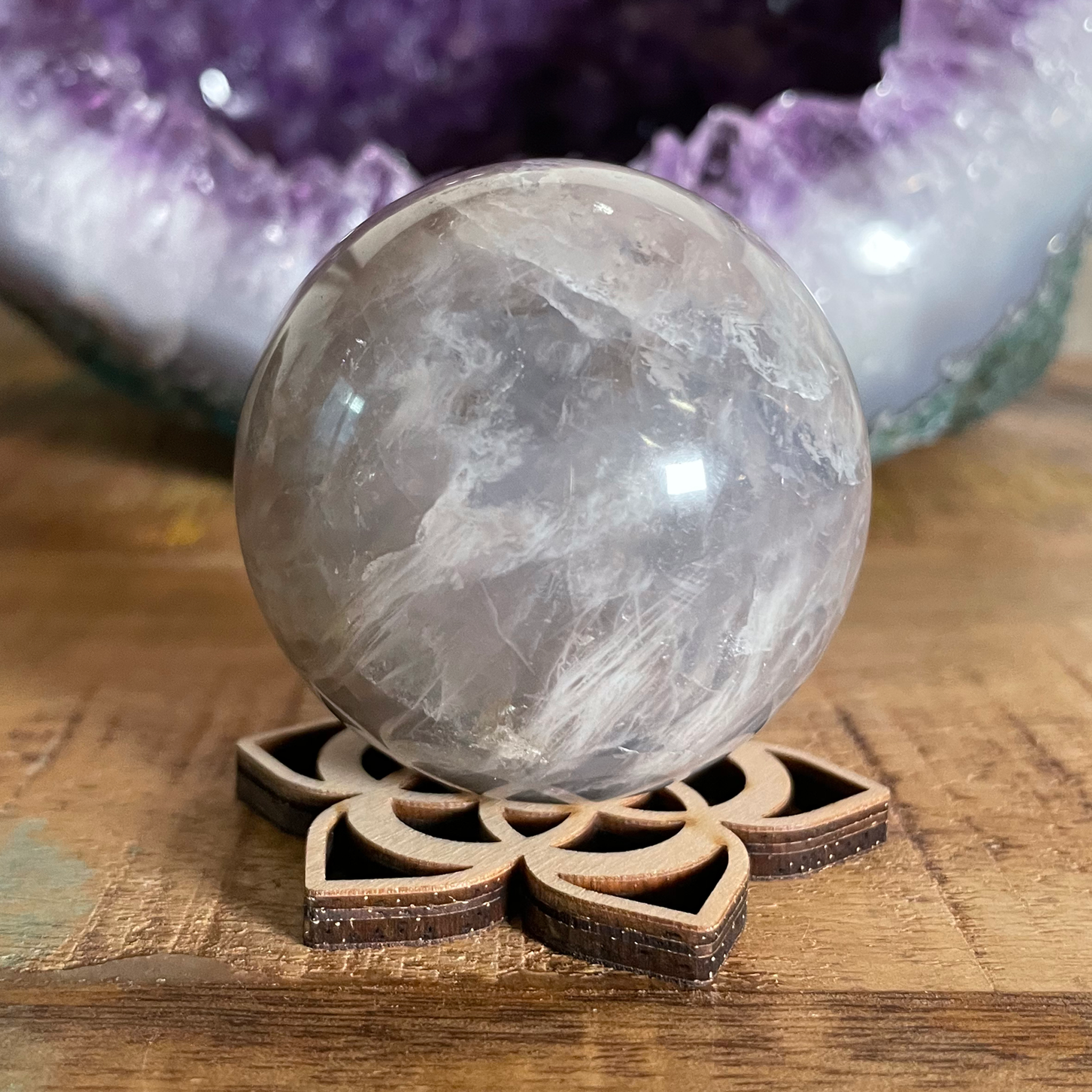 .Blue Rose Quartz sphere. The trade name is “Blue Rose Quartz” these spheres are a periwinkle blue in color and are slightly transparent in spots. You’ll receive this exact sphere.