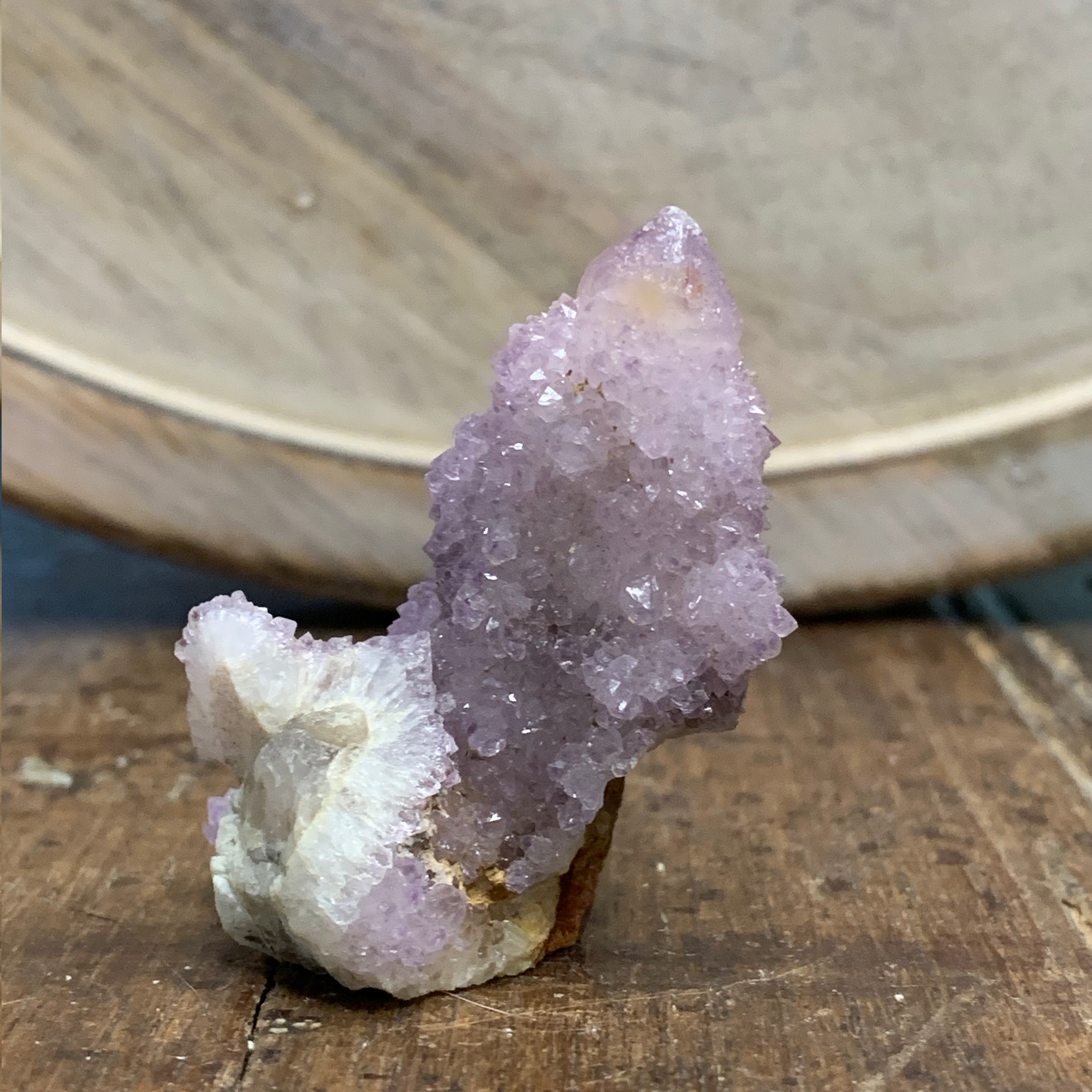Spirit Quartz is an unusual member of the Quartz family - a community within a stone. Its core, a larger, candle-shaped crystal with a faceted termination point, is encrusted with hundreds of smaller crystal termination points. Also referred to as Cactus Quartz or Porcupine Quartz, it is found only in the Magaliesberg Mountain region of South Africa, first appearing around 2001. Most Spirit Quartz is Amethyst, though Citrine, Smokey, and White Quartz are also mined.