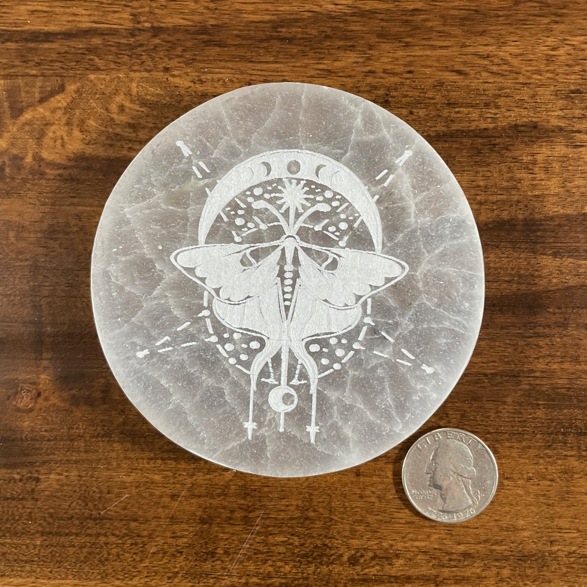 Moon & Moth Etched Selenite Charging Plate, Selenite Charging Plate