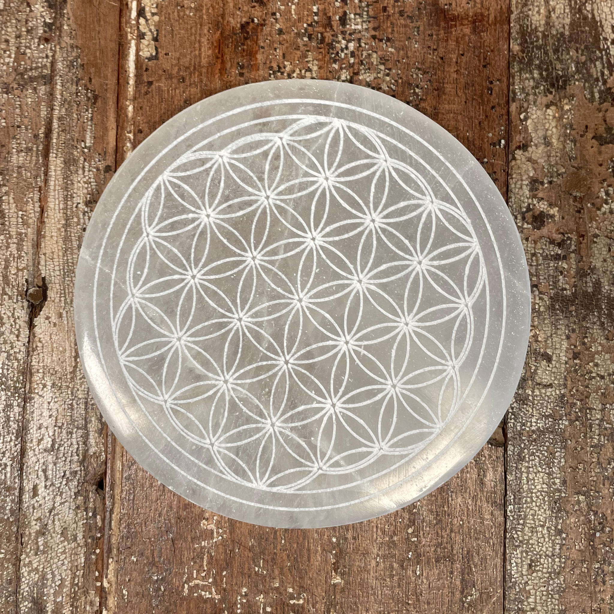 Flower of Life Etched Selenite Charging Plate, Selenite Charging Plate