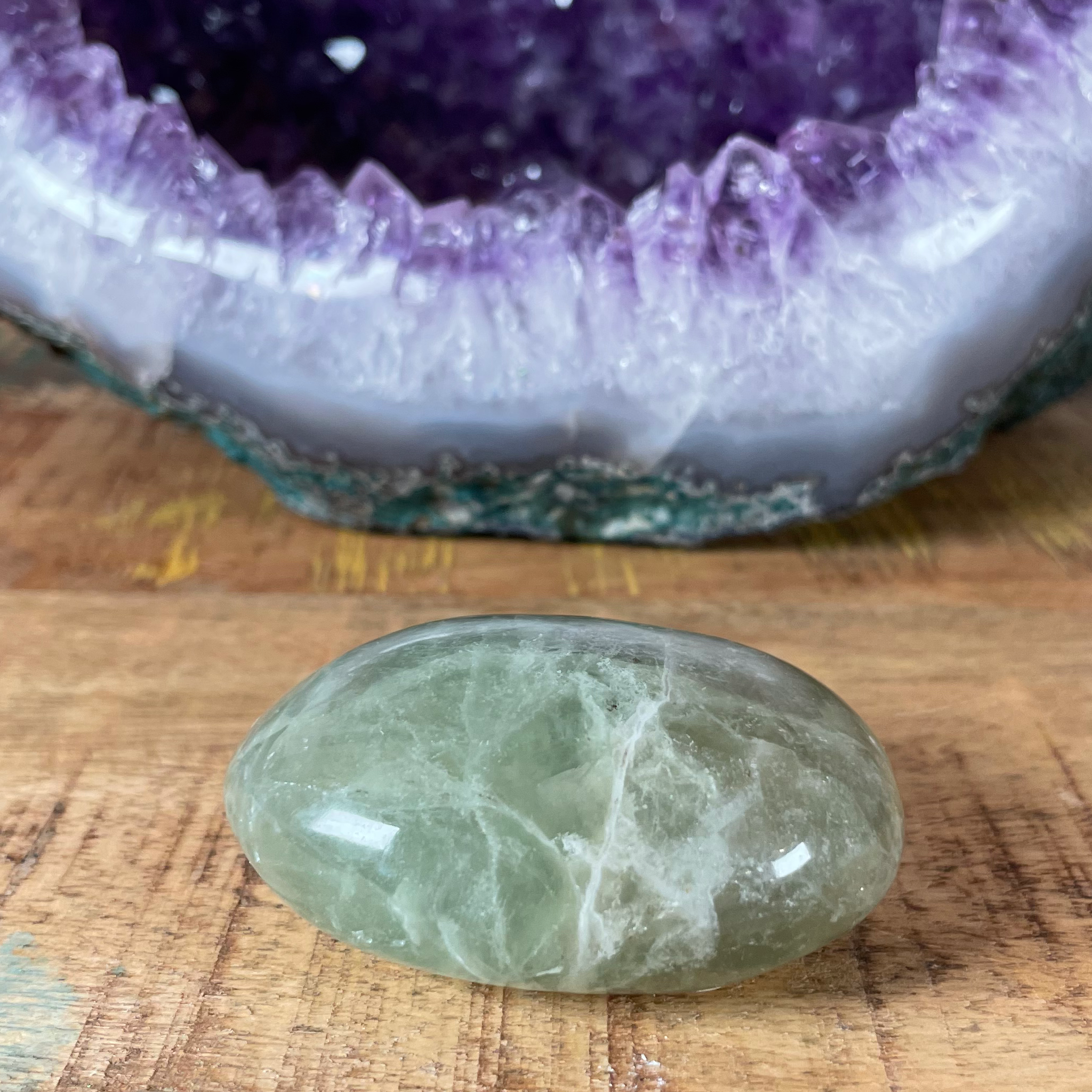 Gorgeous Green Fluorite Puffy Palm Stone. Fluorite draws out negative energies and stress of all kinds. It cleanses, purifies, dispels, and recognizes anything within the body that is not in perfect order. This is the best crystal to use to overcome any form of disorganization. It also works great for pain. It is also effective in helping with joint pain, inflammatory diseases. An excellent stone for focus!