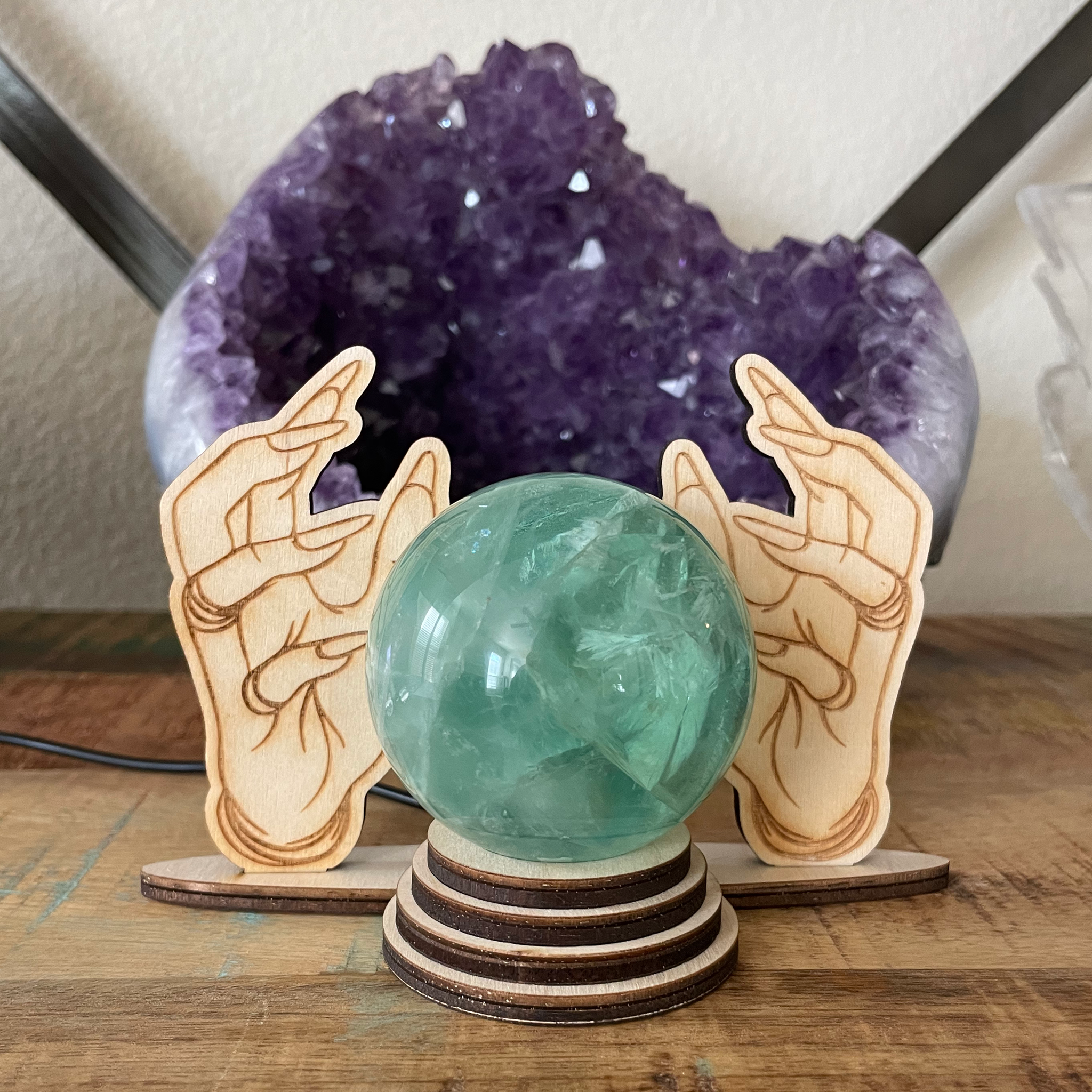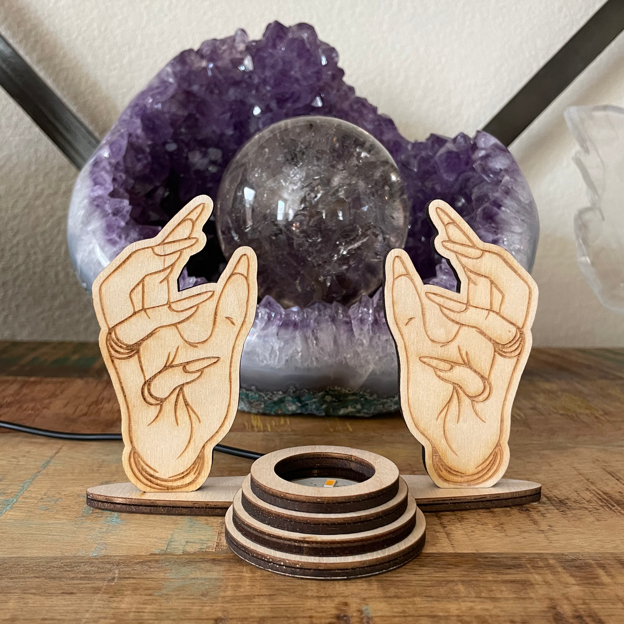 Wood laser cut Readers Hands Crystal sphere/Crystal ball holders. Beautiful with and without the light on. I love to use this Lighted Sphere holders in my healing studio for light during healing sessions! A great nightlight and sacred space/altar light as well.