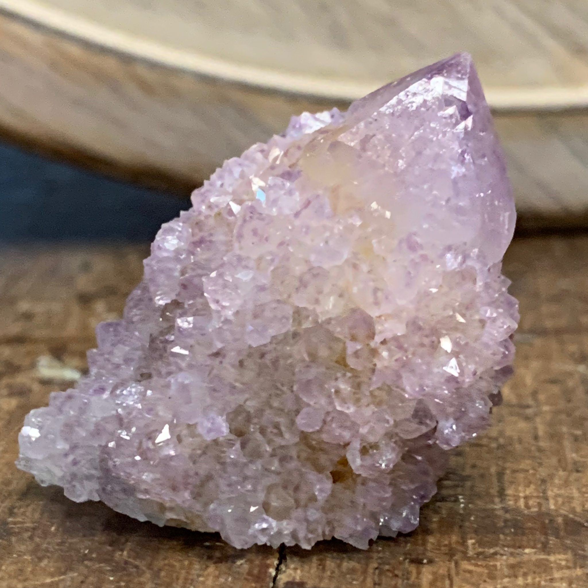 Spirit Quartz is an unusual member of the Quartz family - a community within a stone. Its core, a larger, candle-shaped crystal with a faceted termination point, is encrusted with hundreds of smaller crystal termination points. Also referred to as Cactus Quartz or Porcupine Quartz, it is found only in the Magaliesberg Mountain region of South Africa, first appearing around 2001. Most Spirit Quartz is Amethyst, though Citrine, Smokey, and White Quartz are also mined. This formation presents as a twin with a small bridge (appears to have another small formation sideways on one side).
