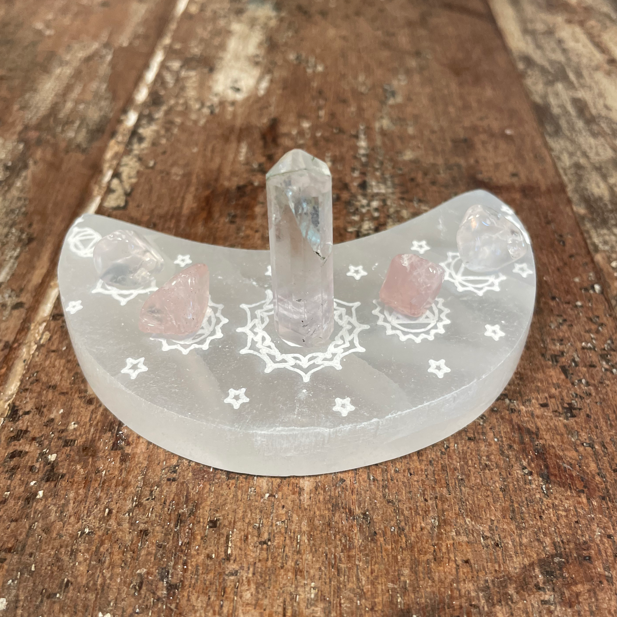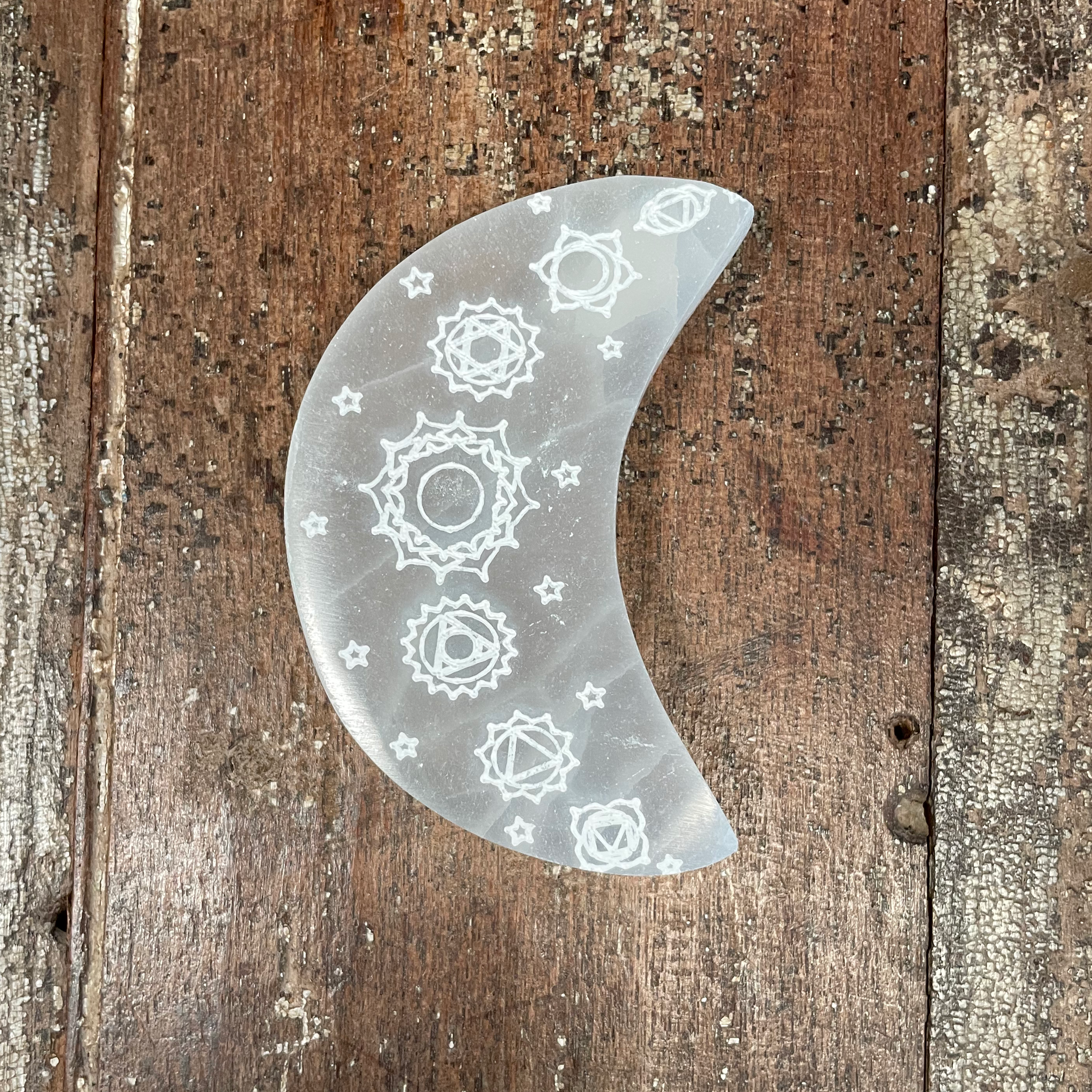 Moon Shaped Chakra Etched Selenite Charging Plate, Selenite Charging Plate