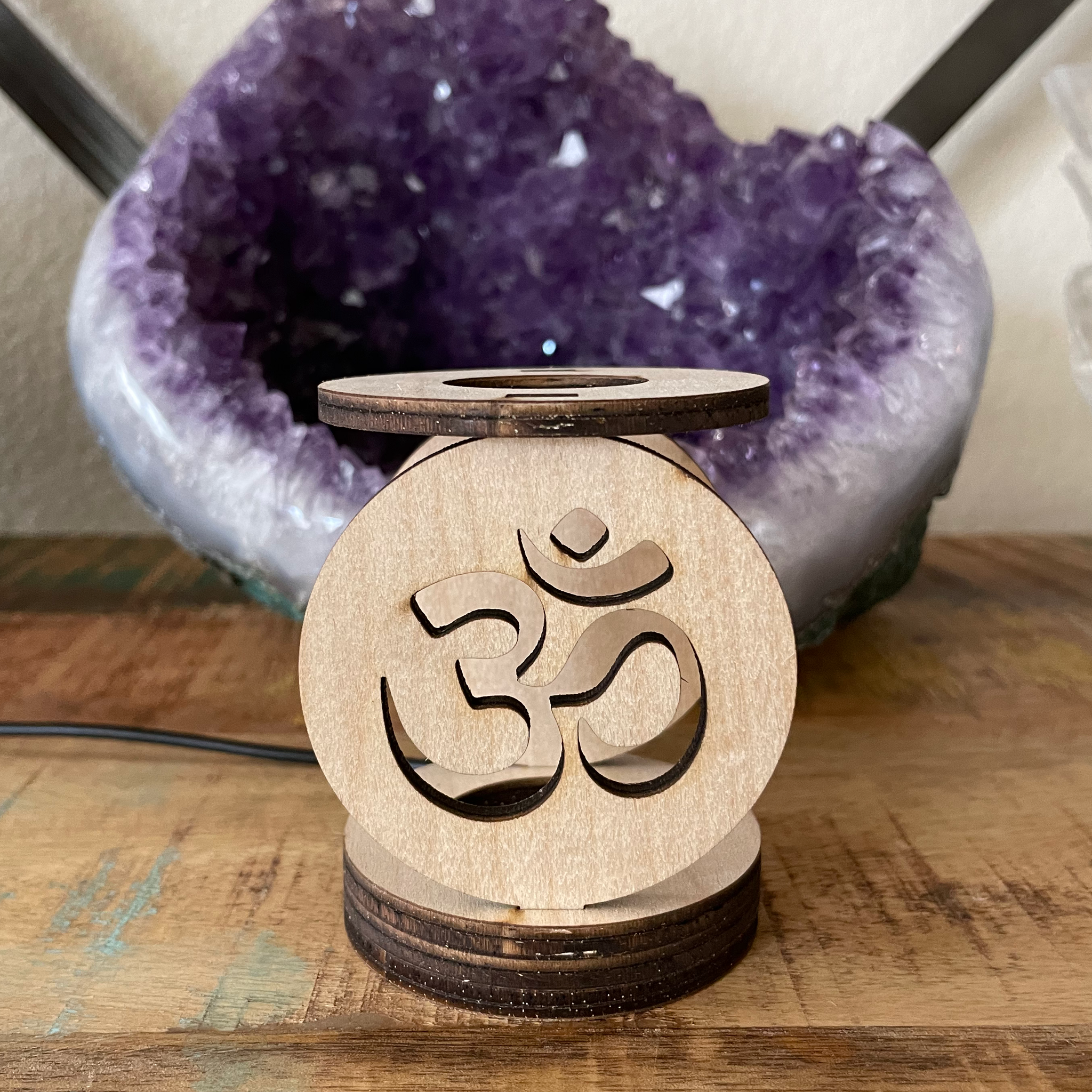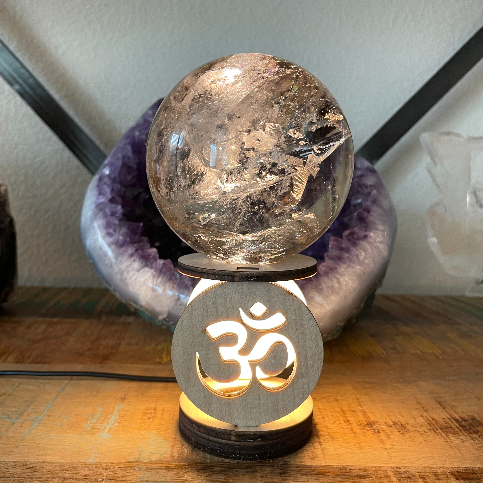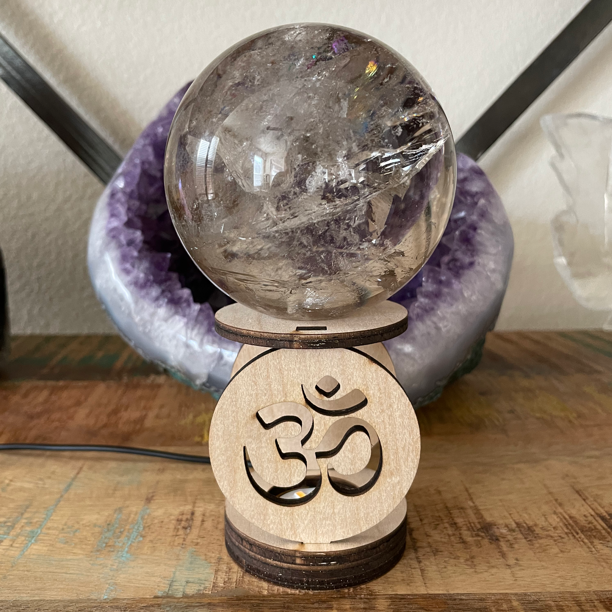 Wood laser cut Om Crystal sphere/Crystal ball holders. Beautiful with and without the light on. I love to use this Lighted Sphere holders in my healing studio for light during healing sessions! A great nightlight and sacred space/altar light as well.