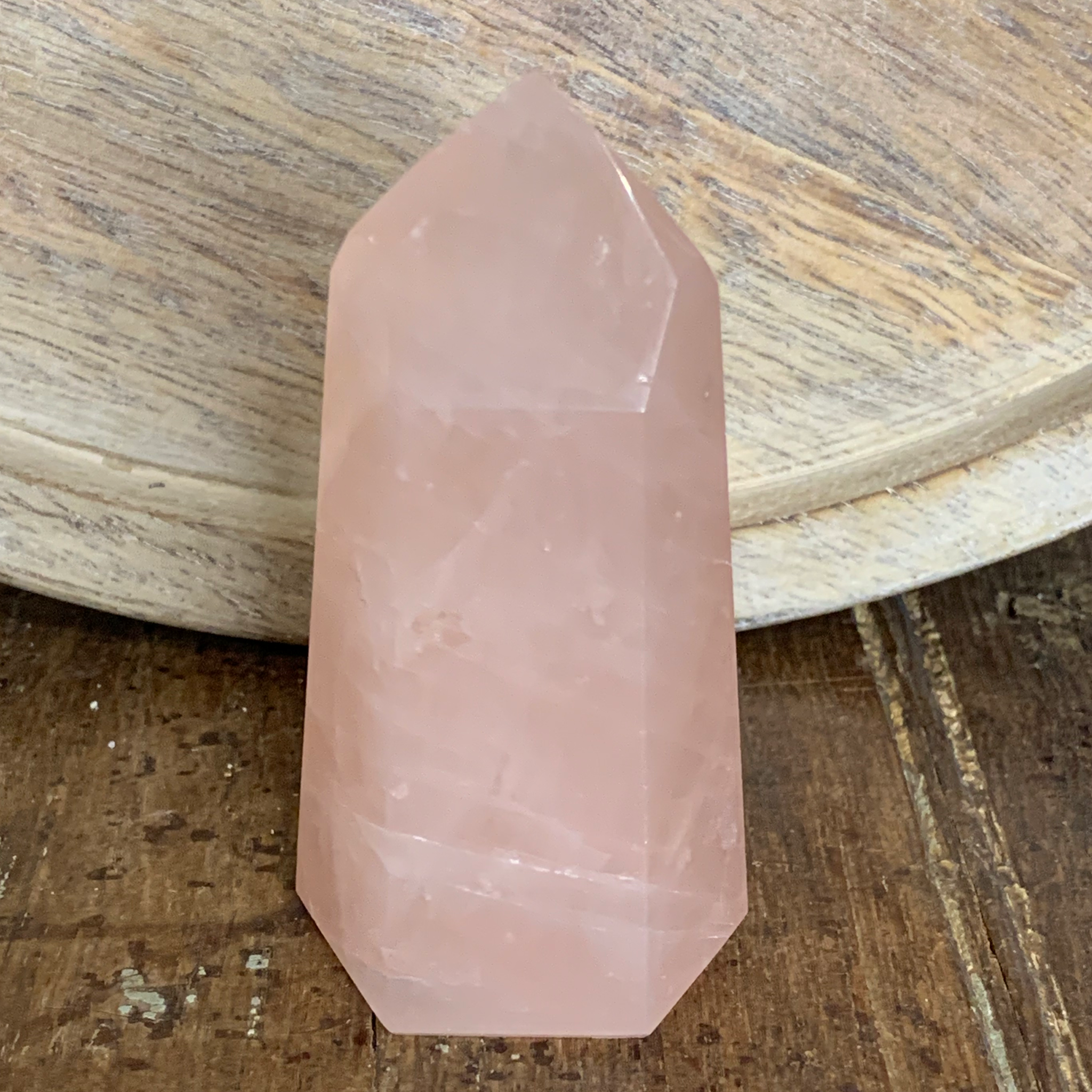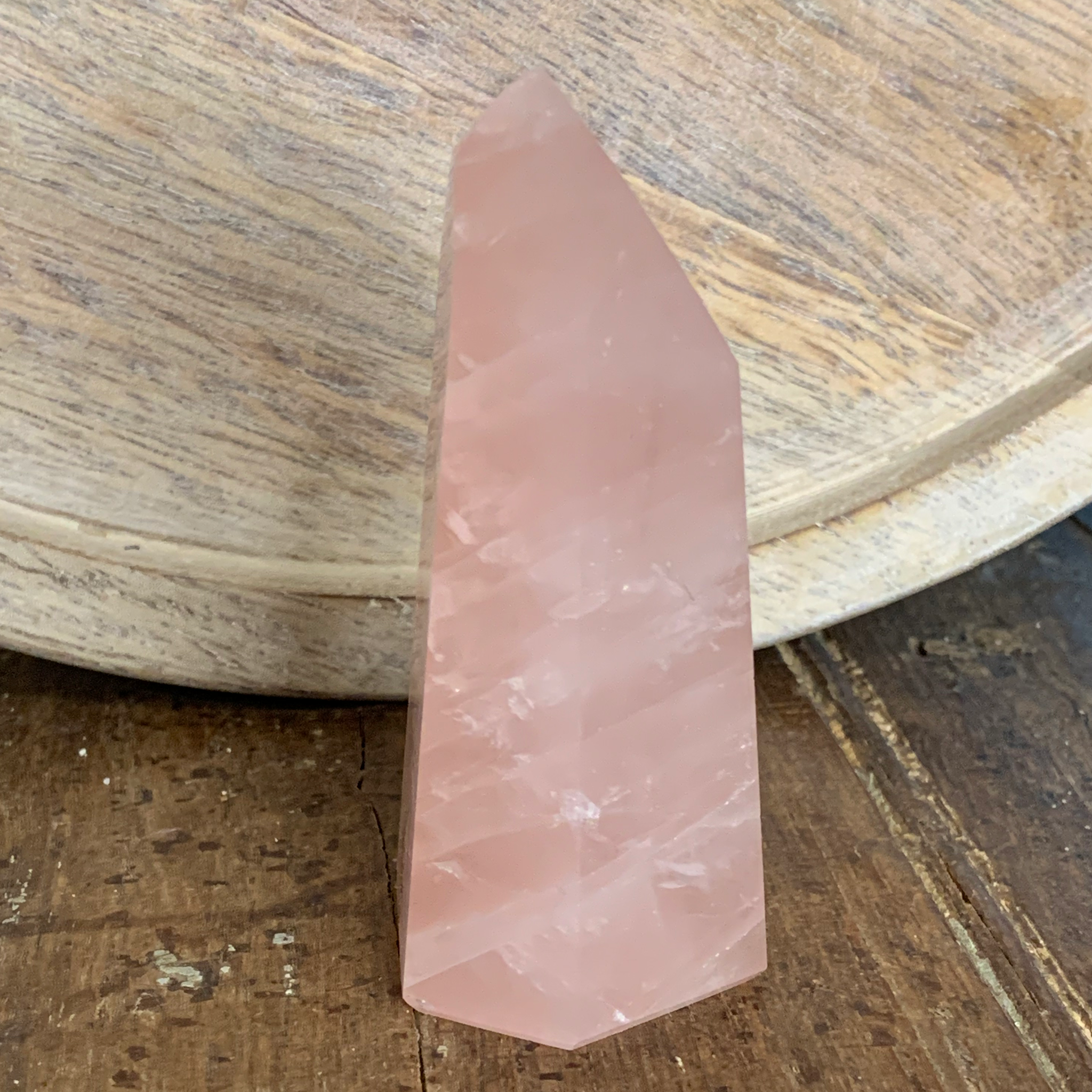 This gorgeous Rose Quartz Tower has spectacular color and stands almost 3.75 inches tall by about 1. 5 inches at its widest point and weighs 136 g. This piece has amazing energy and color! In the group shot, this is the second in from the right.