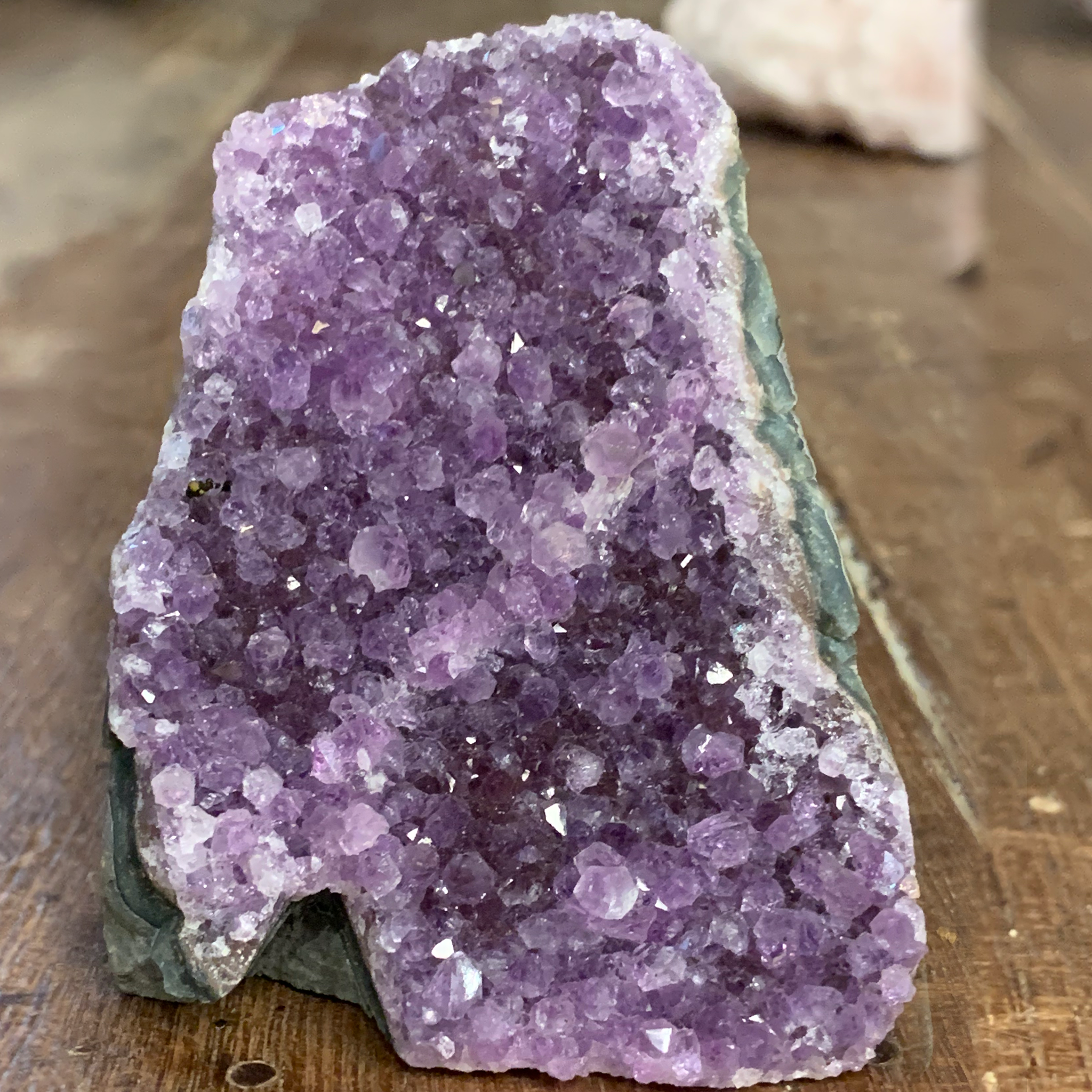 A small amethyst cathedral with a deep rich purple color from Brazil. Backed and set to stand. This piece has gorgeous shades of a red-purple to lavender. Truly beautiful. Great energy when sitting in any space!