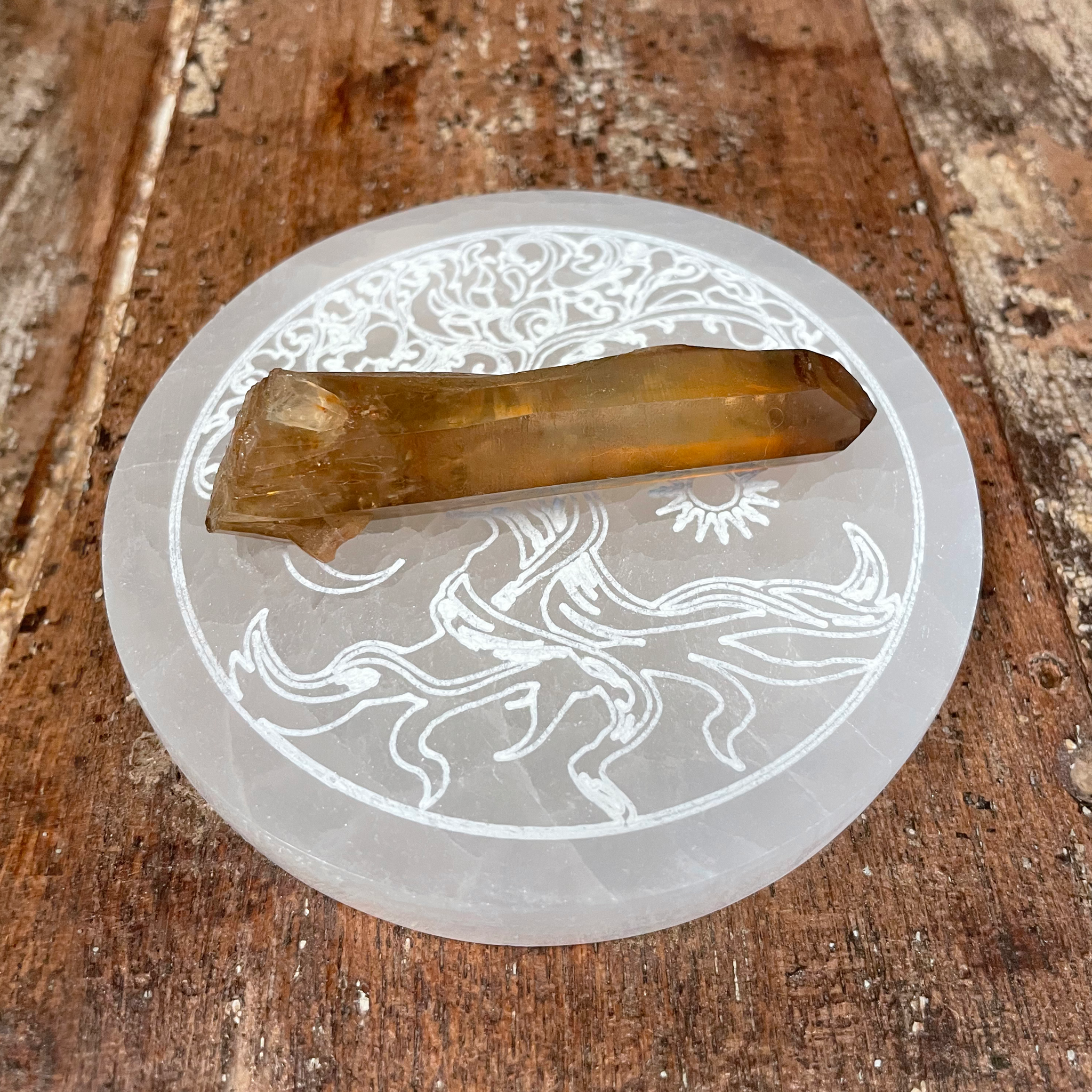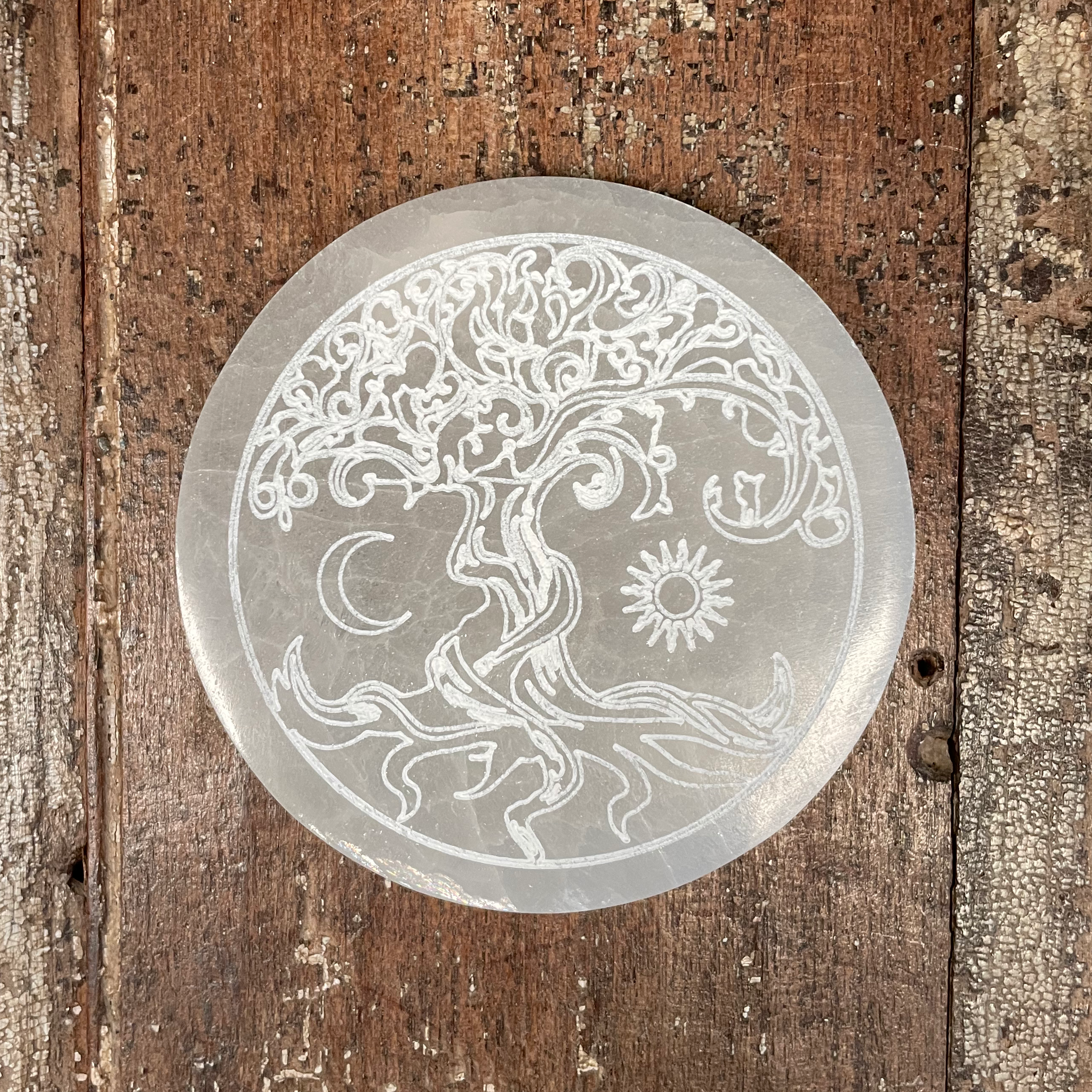 Tree of Life with Sun and Moon Etched Selenite Charging Plate, Selenite Charging Plate