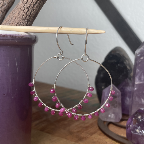 Sterling Silver Hoop Earrings with Faceted Rubies.