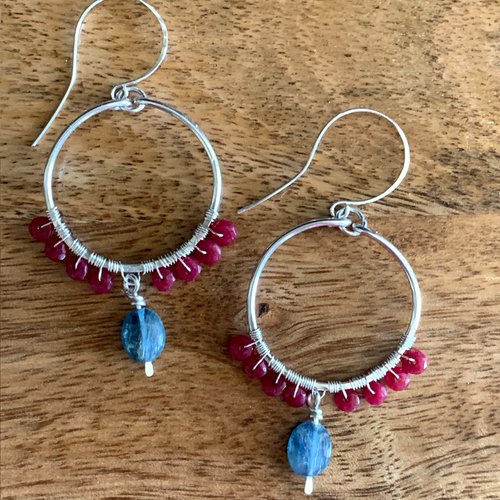 Silver Hoop Earrings with Kyanite + Red Jade- The Tranquil Warrior