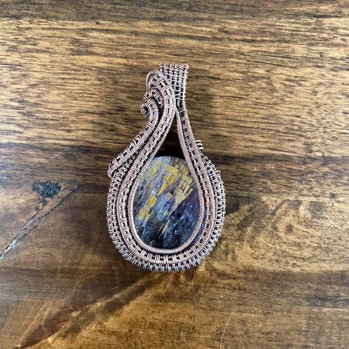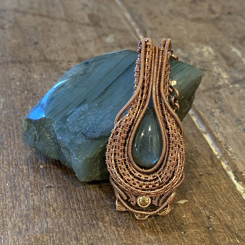 Lapis with Ruby Beads in Copper Wire, Wire Weave Pendant
