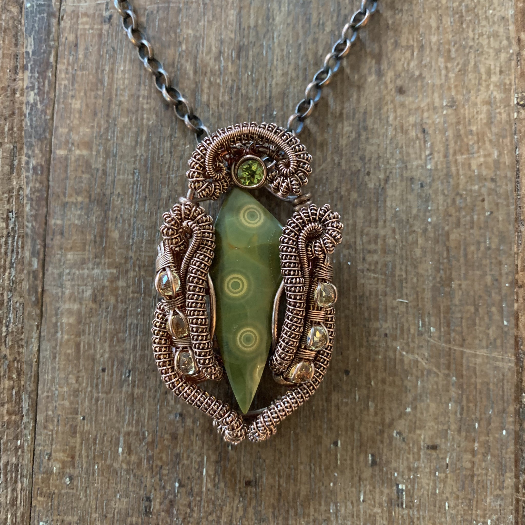 This heady style necklace features a gorgeous ocean jasper cabochon gemstone and six faceted citrines.