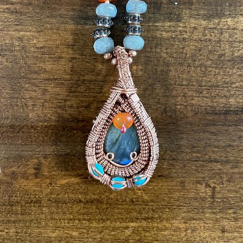 Labradorite, Carnelian and Turquoise Copper Heady Design Pendant