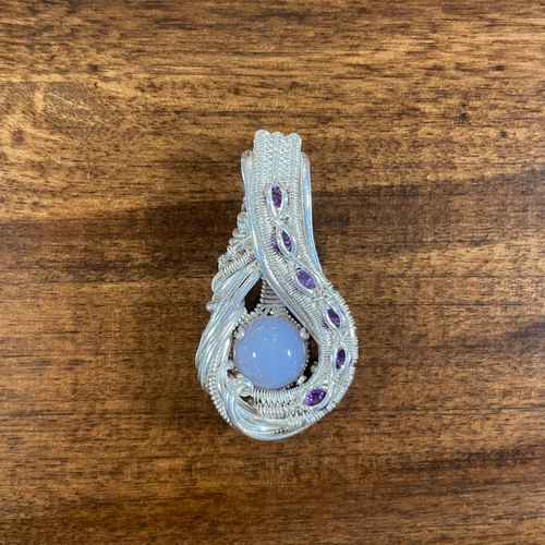 Plum Chalcedony and Amethyst in Sterling Silver Wire Weave Pendant